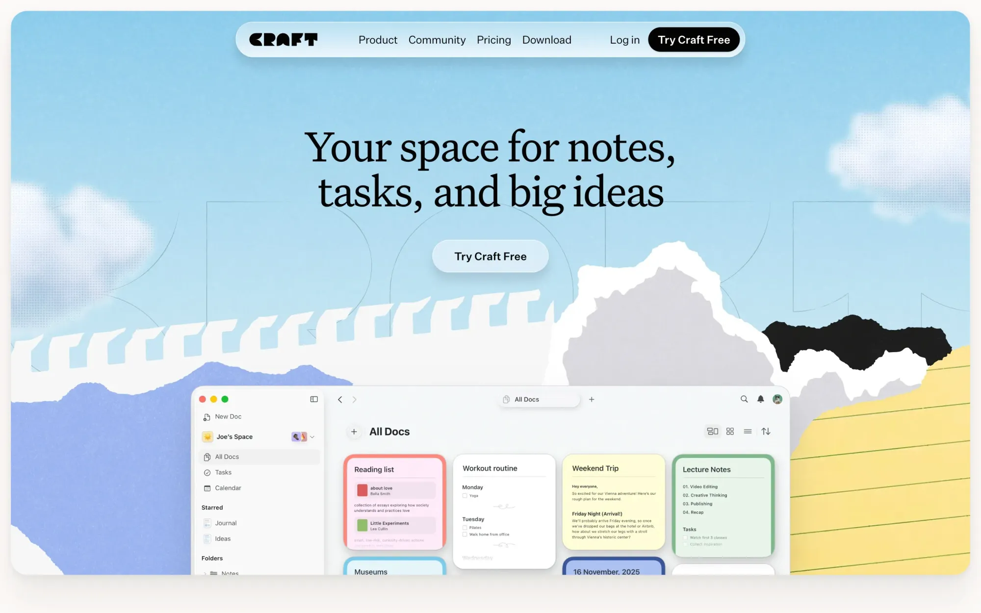 Craft is a fast, polished docs and notes editor for developers who want one flexible workspace for writing specs, planning tasks, and organizing ideas without the friction of heavy tools. It blends structured documents, embedded todos, calendars, and whiteboards into a clean, native-feeling experience that stays out of your way and syncs everywhere.