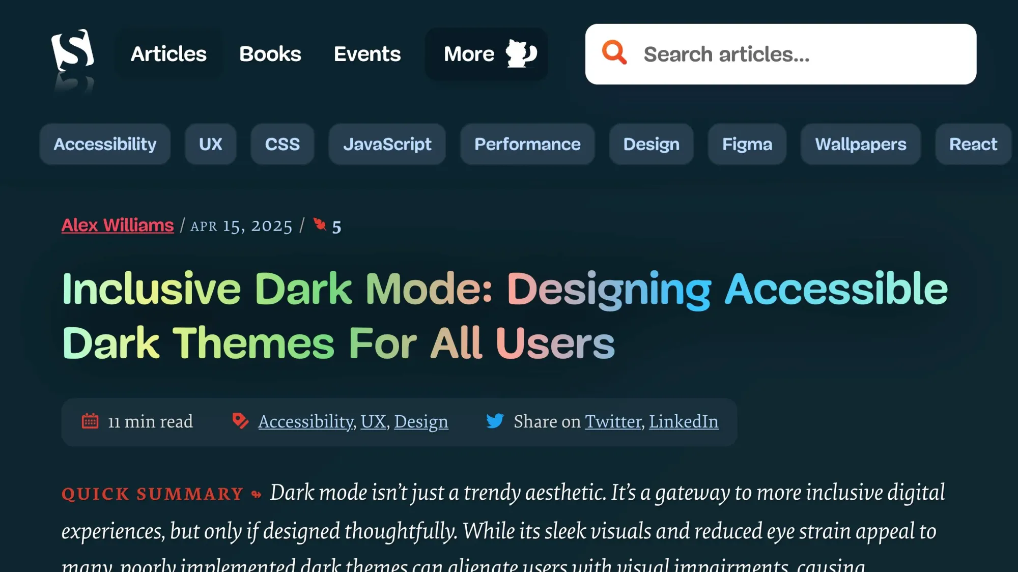 Dark mode is everywhere, but here's the thing, if it's not designed with accessibility in mind, it can actually make things worse for a lot of users. This article dives deep into the do's and don'ts of building inclusive dark themes. You'll learn why pure black backgrounds are a no-go, how to pick the right contrast ratios for readability, and what typography choices work best on dark backgrounds. It also covers how different visual impairments, from astigmatism to glaucoma to cataracts, interact with dark mode in very different ways, which is something most devs don't think about enough. There's also a great section on making sure your dark mode is machine-readable too, which matters more and more as automation grows.
