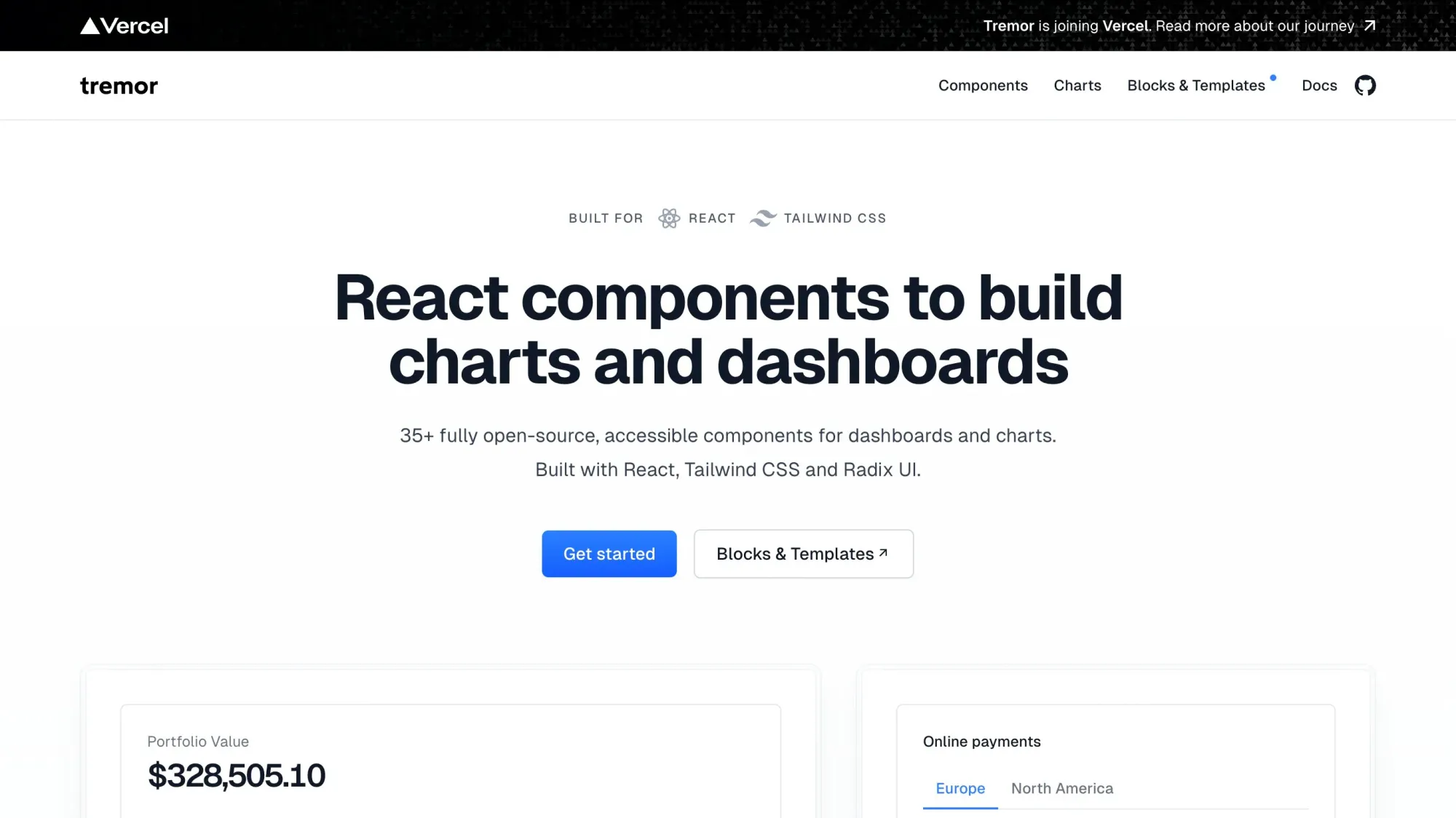 Tremor is a production-ready library of React + Next.js blocks and templates that helps web developers ship beautiful dashboards and data-heavy UIs fast, whether you prefer copyβandβpaste components or an NPM package. Built on a modern stack with clean, customizable primitives (35+ components and 300+ block examples), Tremor lets you skip weeks of bespoke UI work and get to a launch-ready app tomorrow.