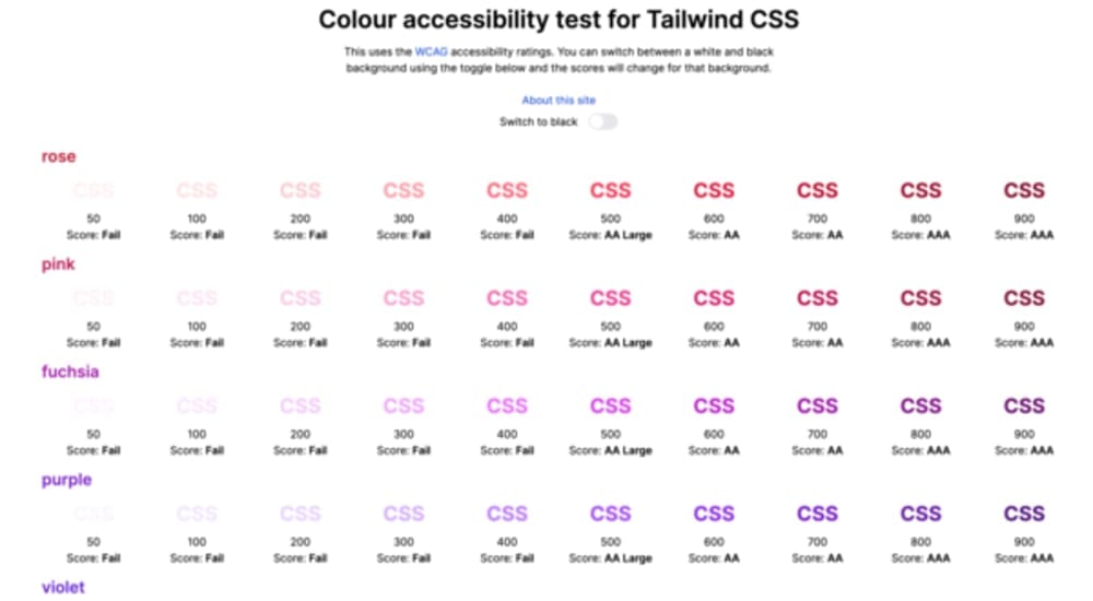 This is a very useful tool if you use tailwind and do a lot of accessibility work. The site shows you the WCAG accessibility ratings for all V2 colors. Better yet, you can switch between a white and black background and the scores will change for that background.