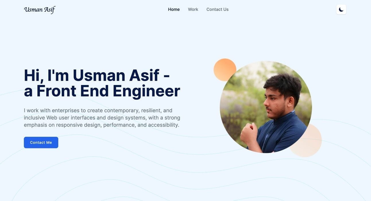 This is a beautiful portfolio site, it uses a lot of Tailwind's default colors but the layout and design make it very unique and aesthetically pleasing. I love its use of background patterns, its varied shapes, and the custom icons. Overall it's a great example of a good-looking portfolio site 🧑🎨.