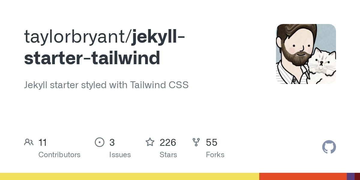 Make no mistake, this is not your average starter, this thing is robust, regularly updated and very well made. So if youâre a fan of Jekyll and Tailwind, I suggest you fork it, modify it to fit your needs and make it a template repository. Youâll thank me later đ.