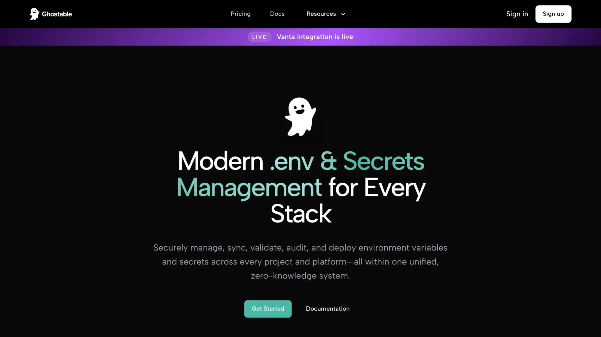 Ghostable is a zero-knowledge .env and secrets management platform that lets web developers securely sync, validate, version, audit, and share environment configs across every project and stack without leaking plaintext to third-party servers. Use the CLI to enforce rules locally, prevent broken deploys with preflight validation, and keep a full change history with rollback and detailed audit logs. Drop it into your existing CI/CD workflow to deploy configs safely with fine-grained org and project permissions, no more emailing .env files or pasting secrets into Slack.
