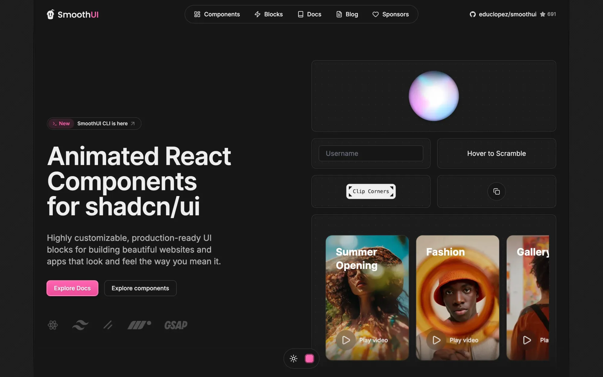If you’re already building with shadcn/ui and Tailwind, SmoothUI looks like a solid way to speed up your UI without sacrificing the “custom-built” feel. It’s basically a set of production-ready, highly customizable blocks you can drop into your app, with smooth animations baked in via Motion and GSAP, and it’s built with modern React patterns (Server Components, TypeScript, hooks) so it should fit nicely into a serious codebase.